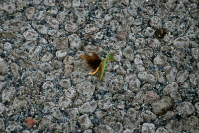 踏まれて瀕死のカマキリ。宿主の異変に中のハリガネムシも出て来ていた。