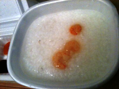 おかゆUP。具は栗とエビ。塩が付いてて味は調整できる。