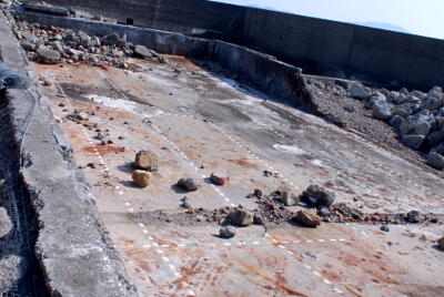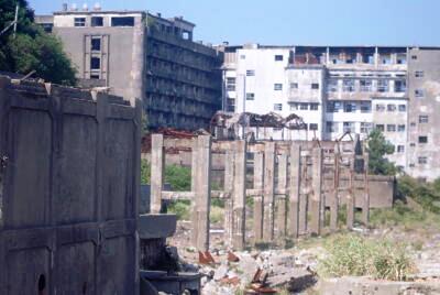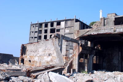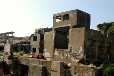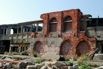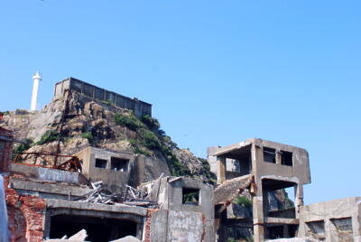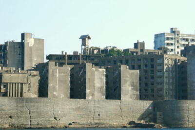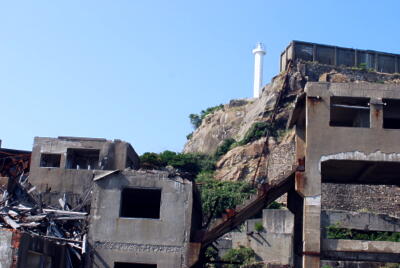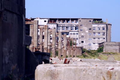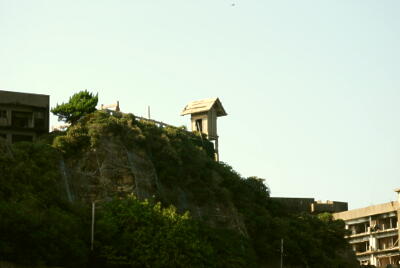 山頂の建物は給水設備。水はないので対岸(長崎半島)から海底水道を引いていた。ちなみにもともとの端島はこの山の部分だけで、埋立てにより面積が3倍近くになったそうだ。