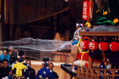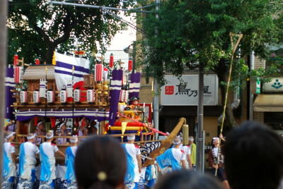 朝5時に起きてタクシーで御旅所に。すでにタダ見エリアには何重にも列が。壁沿いまで下がって立って見ることにする。一番町、東古川町の傘鉾。