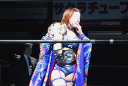 華名は腰にSMASH・DIVA王座ベルトを巻き、肩にWAVEタッグ王座ベルトを掛けて入場(左写真)。