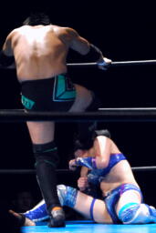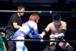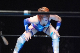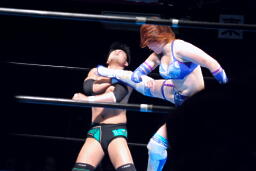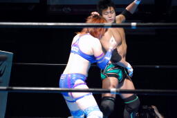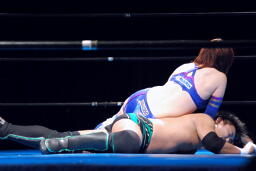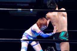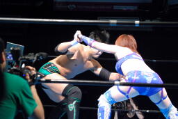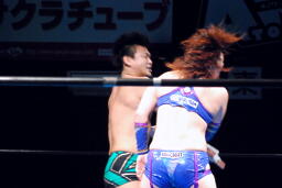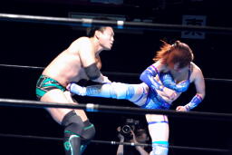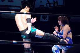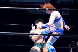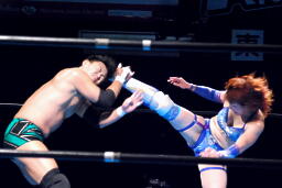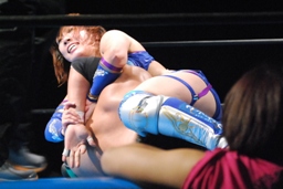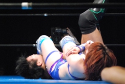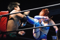 澤は張り手で華名をダウンさせる。華名カウント6で立つ。澤顔面にビッグブーツ(左写真)。
