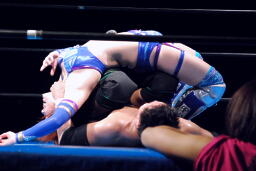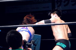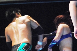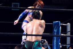 逆に尻餅着いた華名に澤はキック、ストンピング連打(左写真)、華名場外エスケープ。