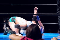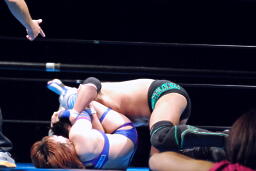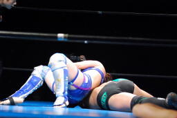 さらに張り手、ローキック連打で倒すとダブルのレッグロックからクロスフェース、さらに腹固めに(右写真)、華名ロープ。5分経過。