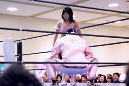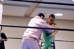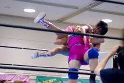 広田逆にボディスラム狙うが下野は首固め(左写真)、カウント2。