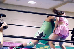 広田シャイニングウィザード失敗、入江と下野はテディベア連弾(左写真)、下野カバー、カウント2。