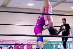 下野広田を担いでバックフリップ(左写真)、カウント2。