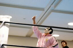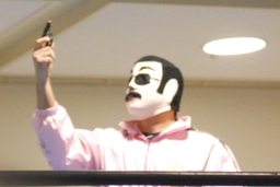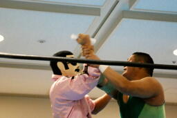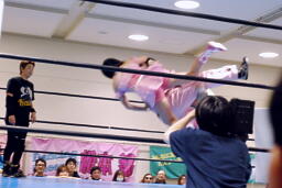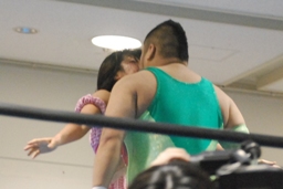 照れる入江(右写真)。なんでもいいのか入江!「さくら!」「茂弘!」と互いの名を呼び、広田が飛びつく、入江キャッチすると3回転してブラックホールスラム。