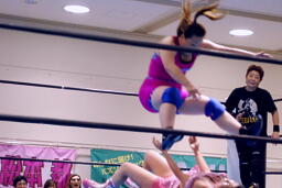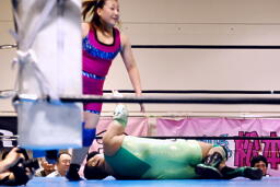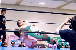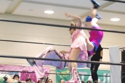 セカンドロープに飛び乗ってライオンサルト(左写真)、カウント2。