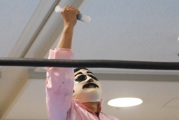 広田下野の腕を取ると天井を気にしながらロープ渡り(右写真)。