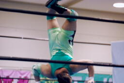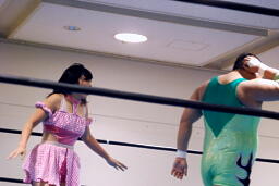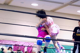 入江がリングにテディベア、振動で広田はトップロープにクロッチ(左写真)。下野コーナーに振って串刺しニーアタック、「オー!」と叫ぼうとするが広田「言わせるか!」とキックで妨害。先輩にタッチ。