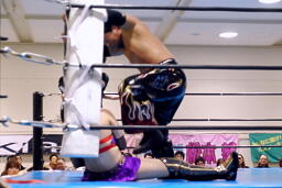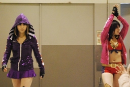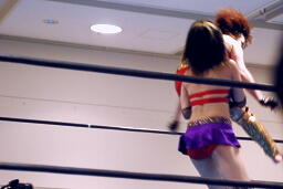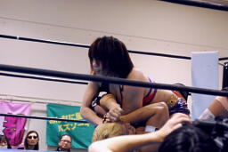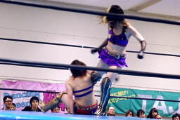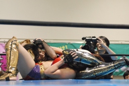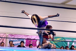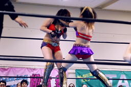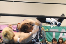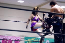 美央ロープに振る、華名ドロップキック(左写真)、TAJIRIにタッチ。