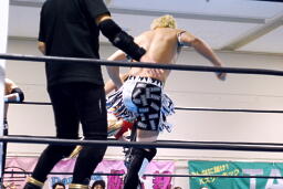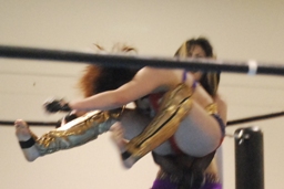 先発は華名とAKIRA。華名ローキック(左写真)。