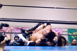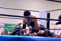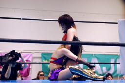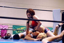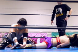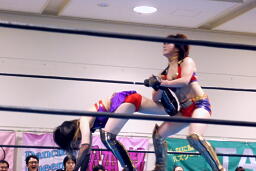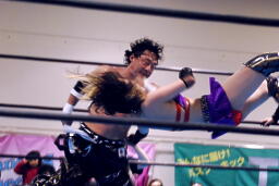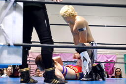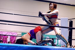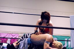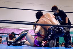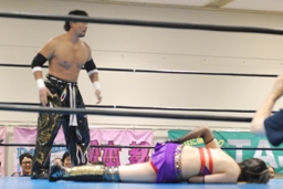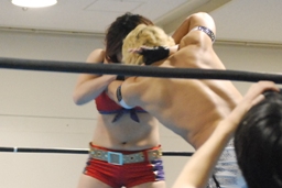 AKIRAストンピング、逆エビ固め(右写真)。リリースして美央にタッチ。