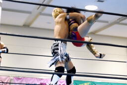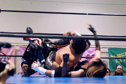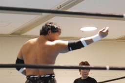 コーナーに振って串刺しのヒザ蹴り(左写真)、首投げからサッカーボールキック、カウント2。AKIRAにタッチ。10分経過。