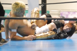 華名転がして上に(右写真)。AKIRA足をすくってレッグロック、華名は十字に切り返す。