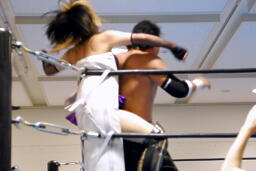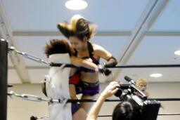AKIRA立ち上がる、華名ローキック連打、AKIRAもガットショットで応戦(左写真)。AKIRAエルボースタッブ、華名コーナーに押し込んでTAJIRIとタッチ。