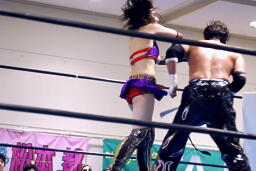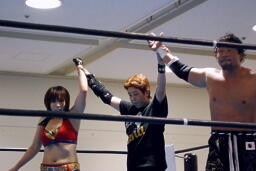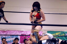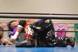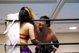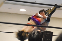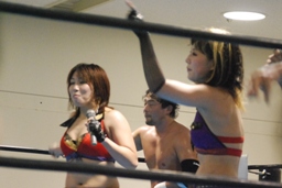 TAJIRIは美央をコーナーに詰めてパンチ連打(右写真)、そしてエビ固め、カウント2。