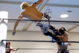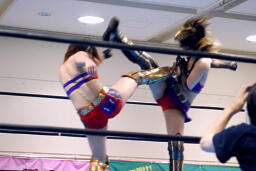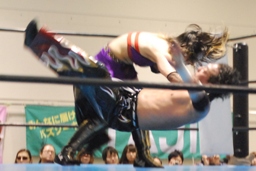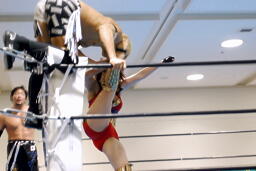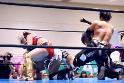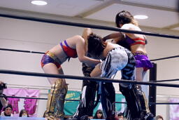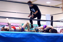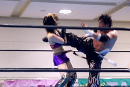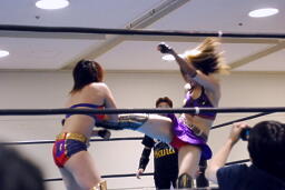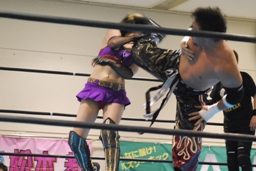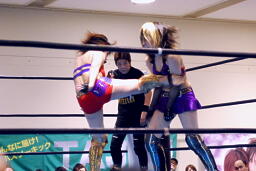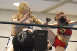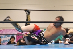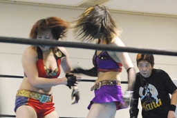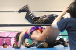 TAJIRIブレーンバスター狙う、美央着地して大外刈り(右写真)、ランニングローキック、カウント2。