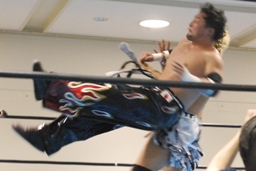 AKIRAドロップキック連打、ロープに振る、TAJIRI切り返す、AKIRAフライングラリアット。AKIRAボディスラム、コーナーに上ってミサイルキック(右写真)、カウント2。