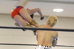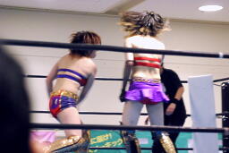 ダブルのブレーンバスターはブロック、美央が入って(左写真)逆に投げようとする、