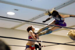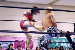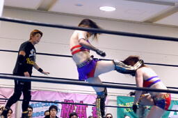 美央ロープに飛ぶ、TAJIRIトラースキック(右写真)、カウント2。