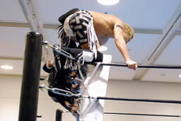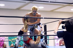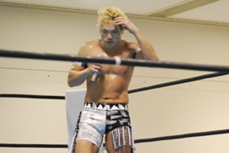 AKIRAボディスラム、コーナーに上る、TAJIRIがハイキック(左写真)。