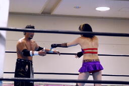 AKIRAエルボー、ロープに振る、華名ブロックしてローキック、張り手、バックスピンキック(右写真)。20分経過。