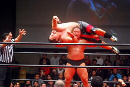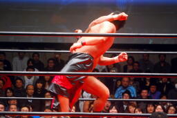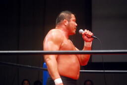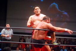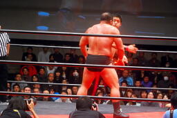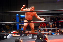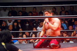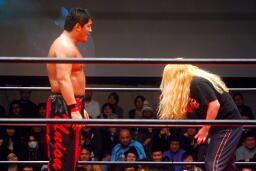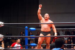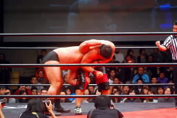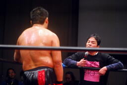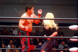 中西「早よせんと、俺も引退してしまうからな。これだけデカい体して、これだけのお客さんに応援してもらうレスラーなんてそうそうおらんぞ。ひとつだけ言っておくけど、今までもろうた頭突きの中で一番凄かった。俺はレスリング、お前は柔道がバックボーンやろうけど、バックボーンにこだわって小っちゃくなるな。お前の肩に皆の希望がかかってんねんからな。お前がやりたかったら何回でも来てやる。」 (左写真)中西いい奴だ。