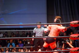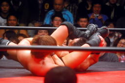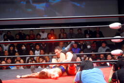 高木ロープに飛ぶ、大家が入ってジャンピングハイキック(右写真)、円華カバー、カウント2。