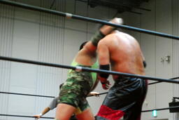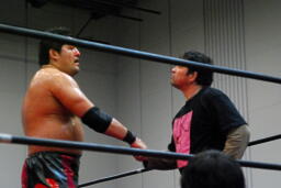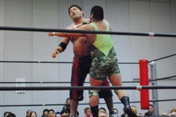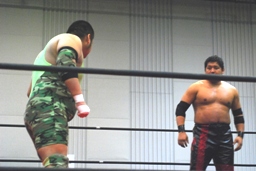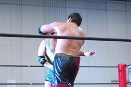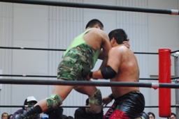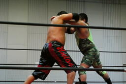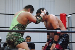 ロックアップ、入江ヘッドロック、石川ロープに振ってショルダーブロックの打ち合い(右写真)、石川ビッグブーツで倒しストンピング。石川が入江を場外に放り投げる。