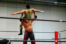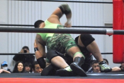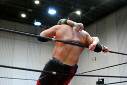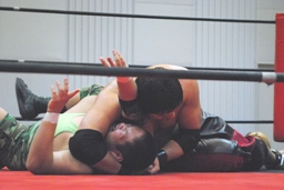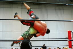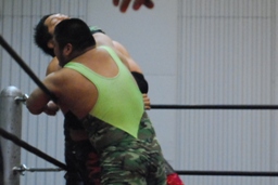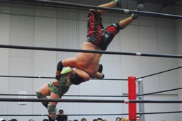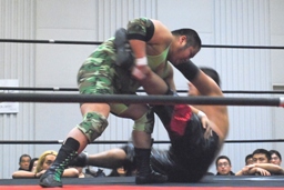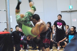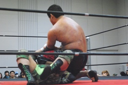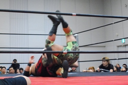 石川逆片エビ、入江ロープ。石川ブレーンバスター狙う、入江抵抗。石川ニーリフト。石川再度ブレーンバスター狙うが入江が切り返す(右写真)。