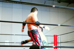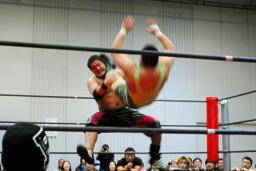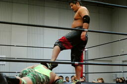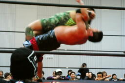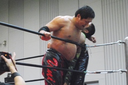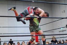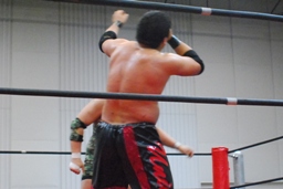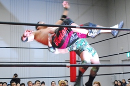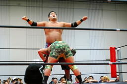 石川コーナーに乗せてからのバックドロップ(右写真)、カウント2。