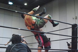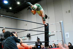 エプロンからダブルアックスハンドル、入江はエルボー、石川逆水平。石川ヘッドバット、場外ボディスラム(左写真)。