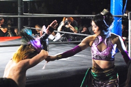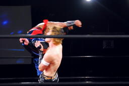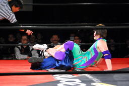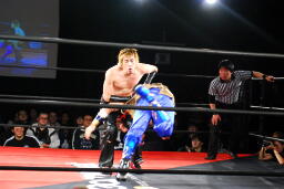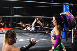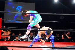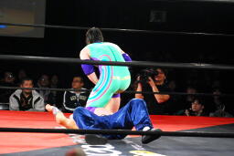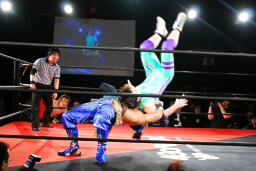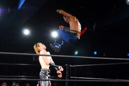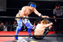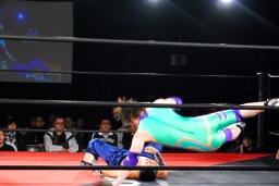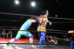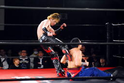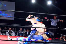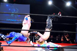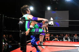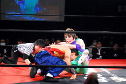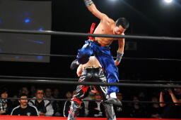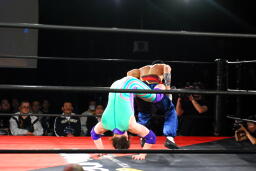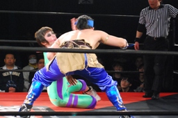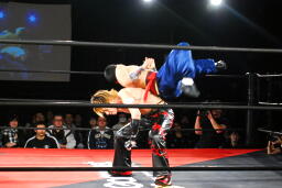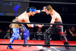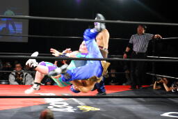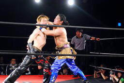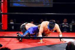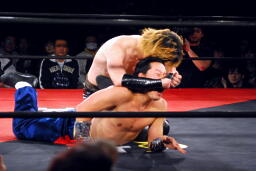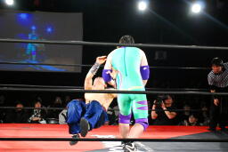 イサミネッククラッチ(左写真)、リリースしてニードロップ、カウント2。矢野にタッチ。矢野スクールボーイでカウント2。体固めでカウント2。フェイスカット、イサミにタッチ。5分経過。