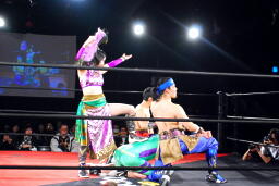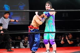 曹彰がバック取るがイサミは切り返す(左写真)。イサミ腕を取る、曹彰切り返す。曹彰フライングメイヤー、イサミヘッドシザーズでブレーク。両軍タッチ。