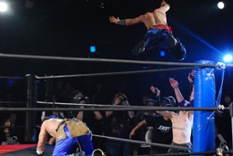 趙雲はイサミを場外に落とすと曹彰の背中→トップロープと飛び移ってミサイルキック(左写真)。曹彰も矢野を場外に落として乱闘に。