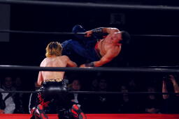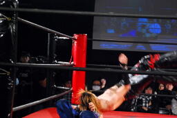 トップロープに飛び乗ってスワンダイブミサイルキック(右写真)、カウント2。10分経過。