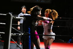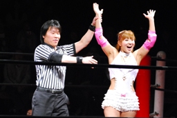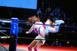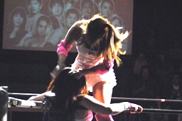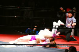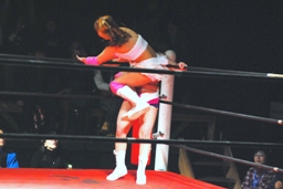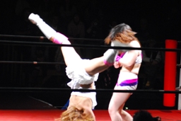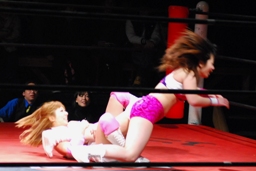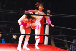チェリーヘアホイップもう一発(右写真)。このムーヴに「昭和の技だ!」という野次が飛び、以降チェリーの技には「昭和」コール、石橋の技には「平成」コールがかかるように。