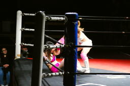 チェリーコーナーに上ってミサイルキック(右写真)、カウント3。