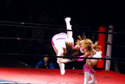 チェリーロープに振る、石橋切り返してパンチ、チェリーは側転でかわす(右写真)。