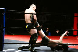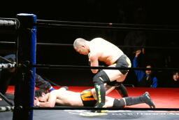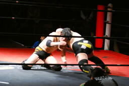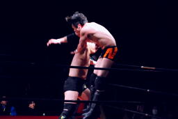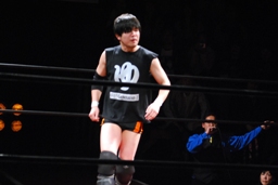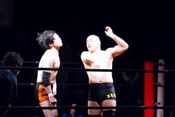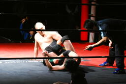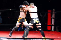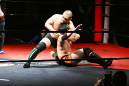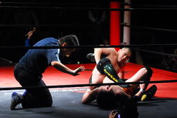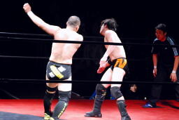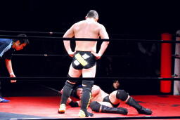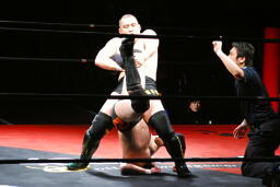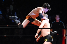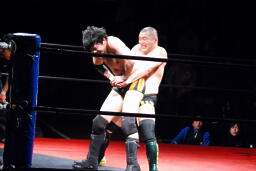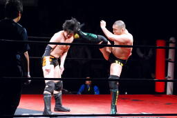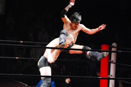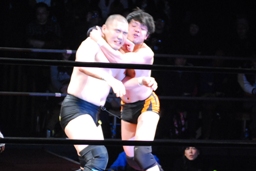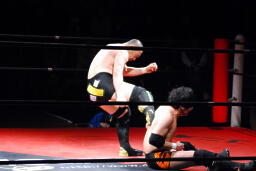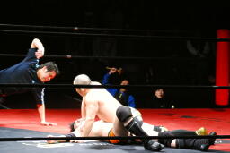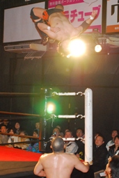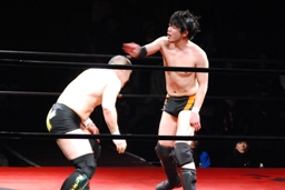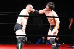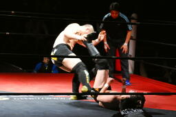 佐藤はコーナーで足を攻撃、突っ込むと冨永カウンターキック、コーナーに上ってダイブ、佐藤は下からパンチで迎撃(右写真)、カバー、カウント2。