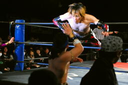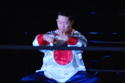 矢野が趙雲を担いでエアプレンスピン、イサミは突っ込んで来た曹彰を場外に落とす(右写真)。