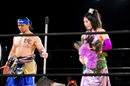 イサミと矢野入場。頑固プロレスのTシャツを着た矢野には「頑固」コール(右写真)。趙雲が「今日ディーバ連れてくるんじゃなかったのか!」と突っ込むとイサミは「カモン!」と呼び入れる。