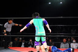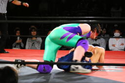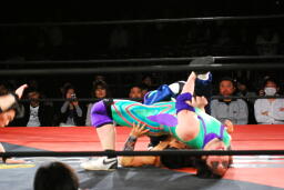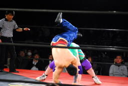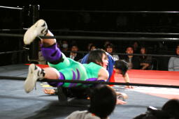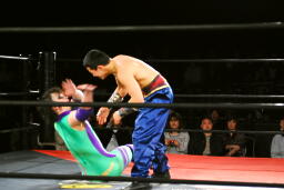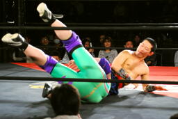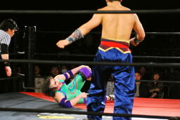 先発は矢野と趙雲。矢野がヘッドロックからフライングメイヤー、趙雲ヘッドシザーズで返す(右写真)。