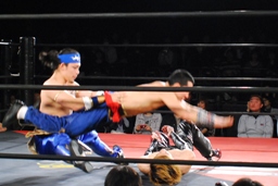 2人が押さえ、真琴姫がフロントハイキック(右写真)。
