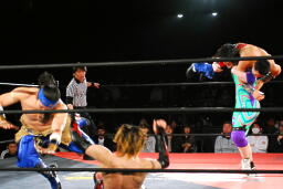 矢野レッグロックに切り返す(左写真)。矢野ひっくり返してエビ固め、カウント2。両軍タッチ。