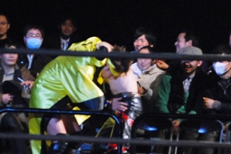 大家がヴェロニカさんを追い回す。ヴェロニカさんはカメラマンを盾に(右写真)。