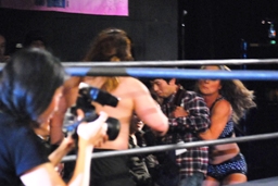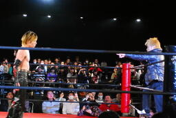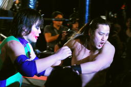 と思ったらMIKAMIがエプロンに現れ、5/4後楽園でのスクールモンキーvs怒頭破血を要求(左写真)。イサミは「時代を一つ終わらせます。スクールモンキーには解散してもらいます。」と。