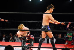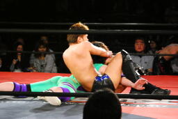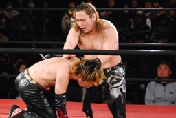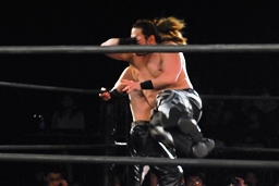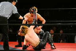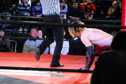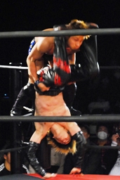 矢野大家に低空ドロップキック、ニークラッシャー、足へのニードロップ(右写真)からギブソンクラッチ、カウント2。